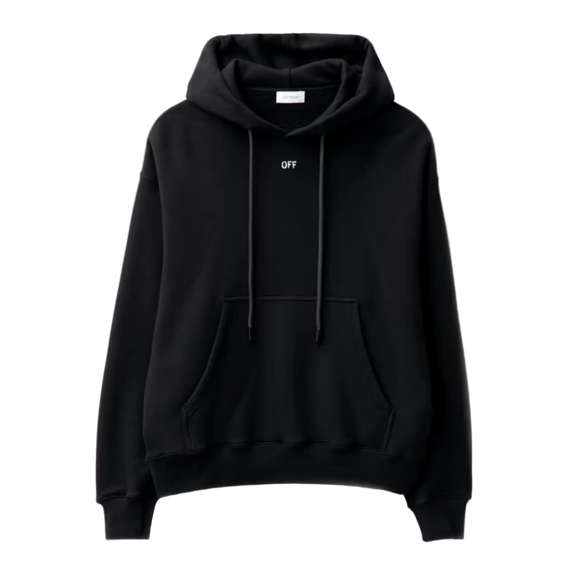 The design features the distinctive “OFF” stamp-style branding, giving the piece an industrial, raw aesthetic that reflects Off-White’s fusion of skate culture and luxury fashion. Finished with a classic kangaroo pocket, adjustable drawstring hood, and ribbed cuffs and hem for a clean, structured shape.